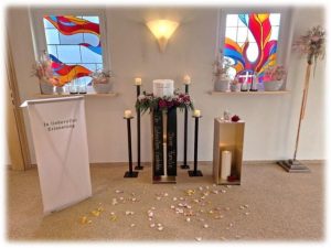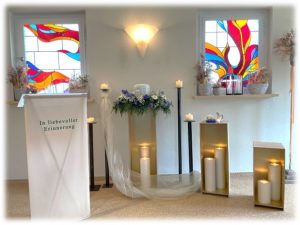 Eine Trauerfeier in unseren eigenen Räumen eröffnet Ihnen viele Möglichkeiten der individuellen Gestaltung. Musik, Dekoration und Ablauf können frei nach Ihren Wünschen bestimmt werden. So entsteht ein ganz persönlicher Rahmen, in dem Erinnerungen und Gefühle ihren Platz finden.